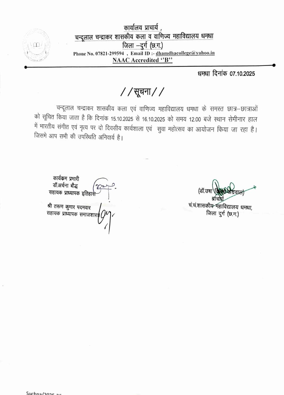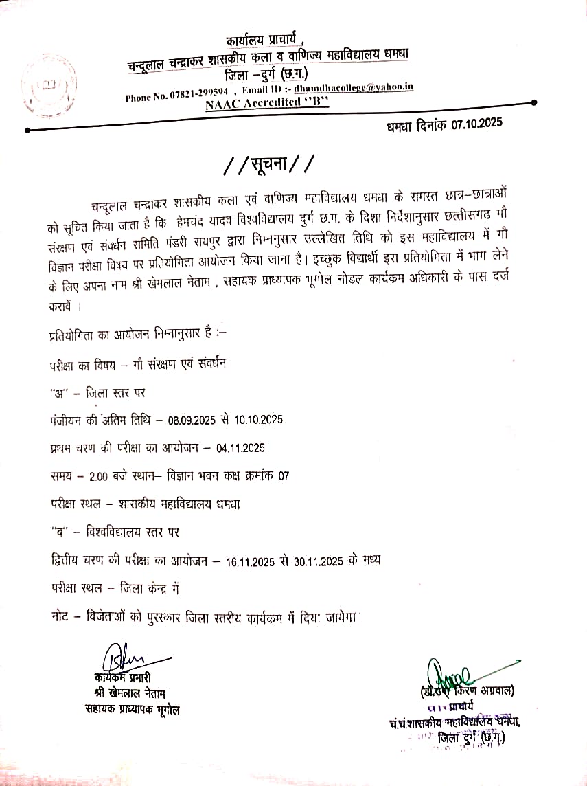 चन्दूलाल चन्द्राकर शासकीय कला एवं वाणिज्य महाविद्यालय धमधा में आपका स्वागत है